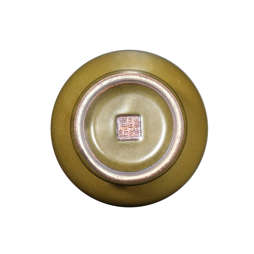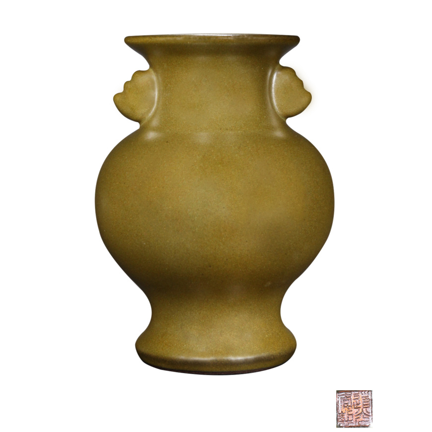 描述:本器撇口、鼓腹、圈足,颈饰双耳,底部落“道光年制”款。通身施茶叶末釉,釉色黄绿相杂,釉面温润如玉,色泽沉稳内敛,娇艳不俗,此器整体优雅素净,俏拨大方。双鲁耳以精巧的手法雕琢而成,釉色与瓶身保持一致,线条流畅而富有张力,与瓶身整体造型相得益彰。《陶雅》记载:“茶叶末,黄杂绿色,娇娆而不俗,艳于花,美如玉”,是为其誉。以茶叶末为代表的“厂官釉”变化多样,其中包括专门模仿古铜、古玉的釉色,制作更为不易。这件双耳尊,器形厚重端庄,釉色古朴,仿古铜色质感逼真,是清朝不可多得的茶叶末釉瓷器精品。