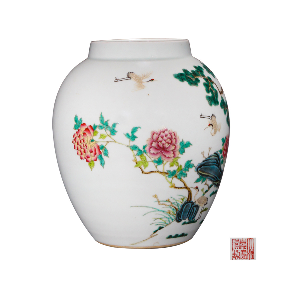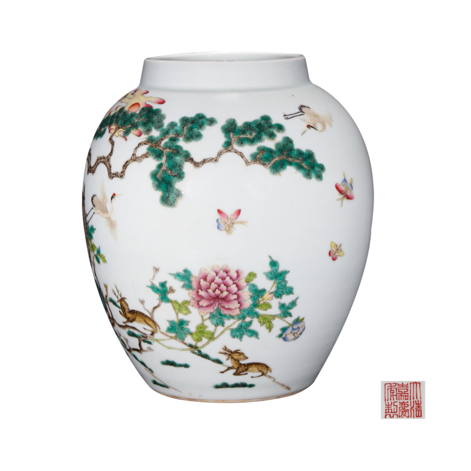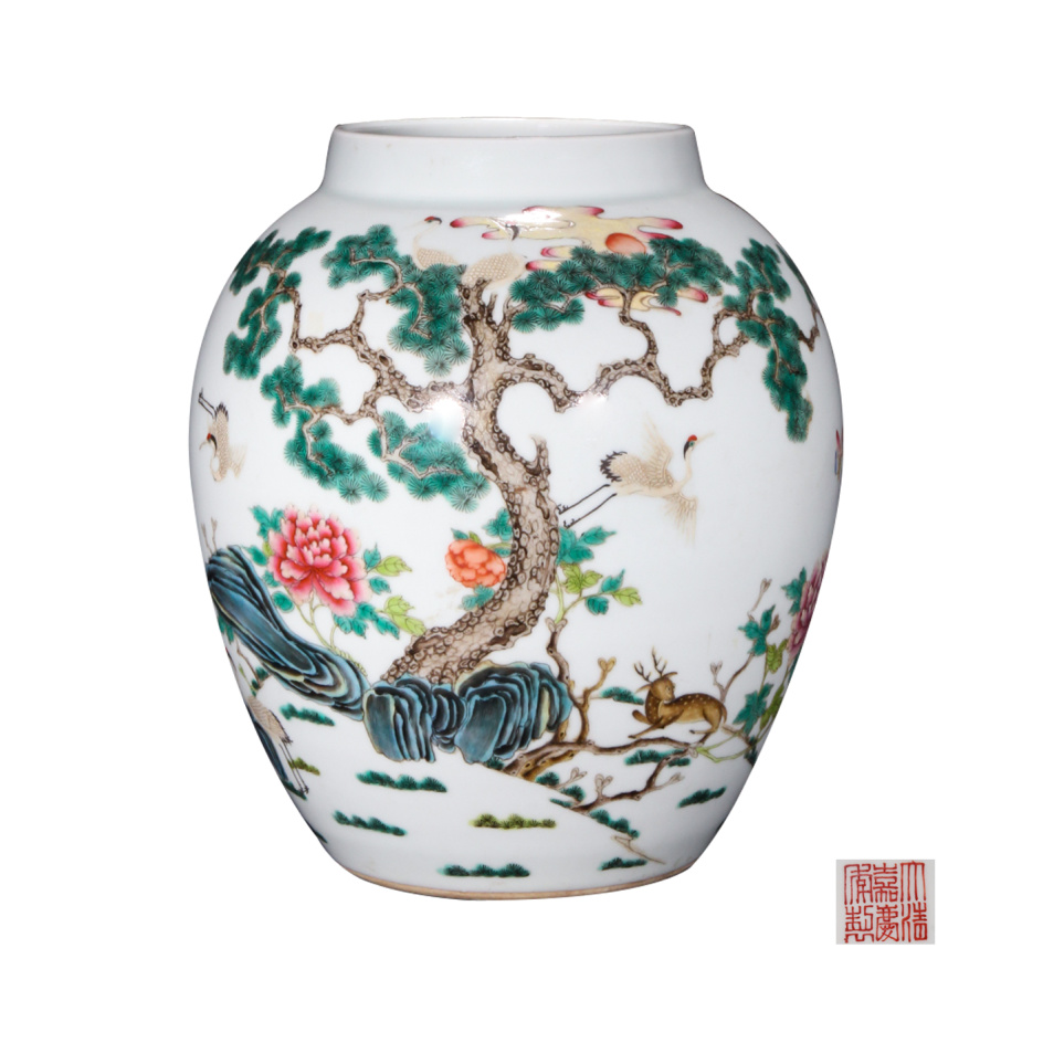 描述:本器直口,短颈,弧腹,罐身呈鼓形,圈足,底部落“大清嘉庆年制”款。通体施白釉为地,釉面匀净温润,釉质莹白如玉。罐身以细腻粉彩工艺通景绘松鹤延年图,粉彩施彩浓淡相宜,设色妍而不俗。画面中,松树挺拔峭立,仙鹤姿态各异,或曲颈回眸,或振翅欲飞,小鹿、蝴蝶、花卉等点缀其间,生动传神,惟妙惟肖。此器整体端庄雅致,绘画细腻传神,为清嘉庆粉彩器极精之作,传世甚为罕见。