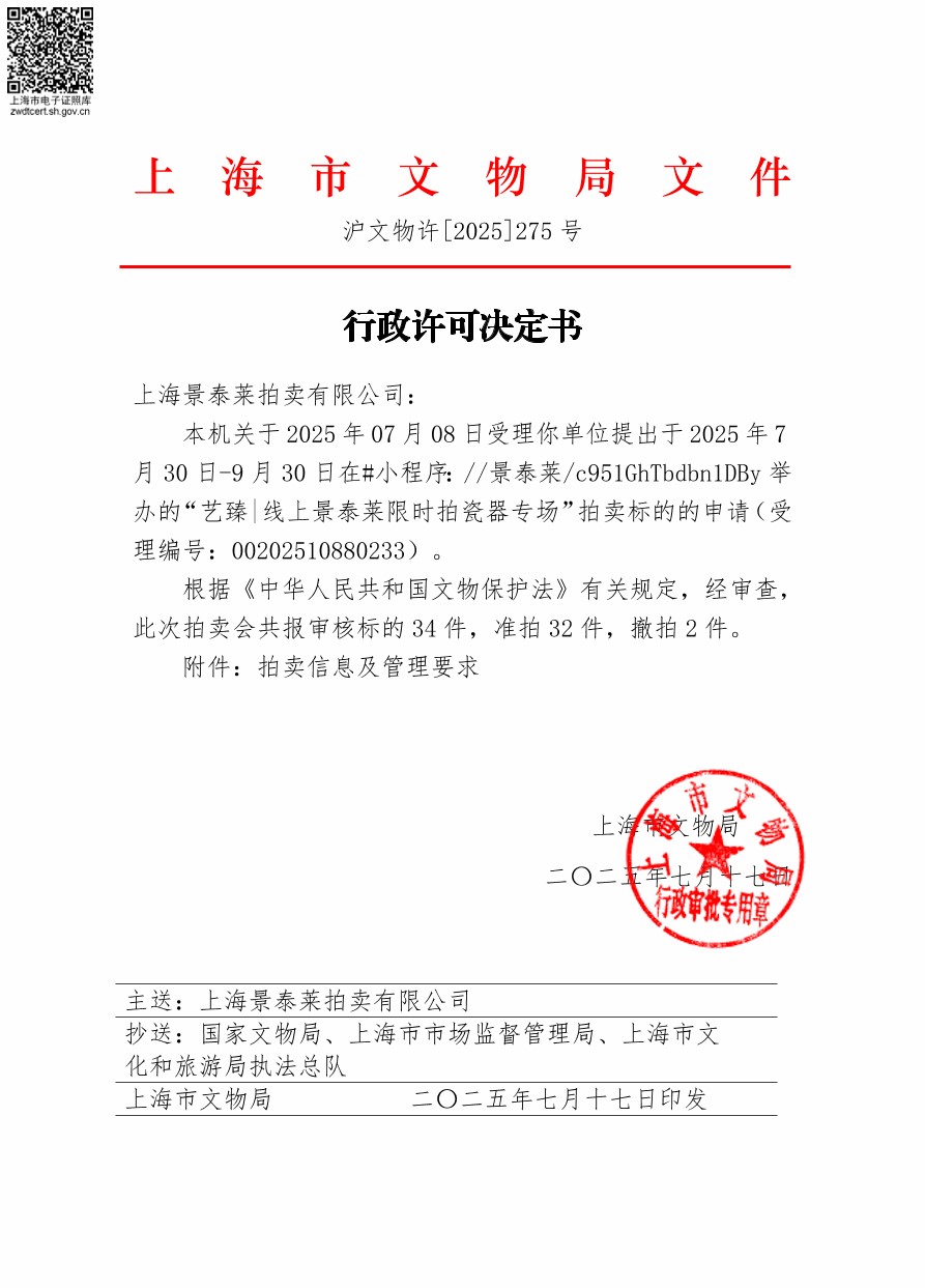 上海景泰莱拍卖有限公司成立于2021年,办公地址位于上海市四川北路859号中信广场17楼。是一家主营文物艺术品如古董珍玩、近现代书画、古代钱币、珠宝的综合性拍卖公司。