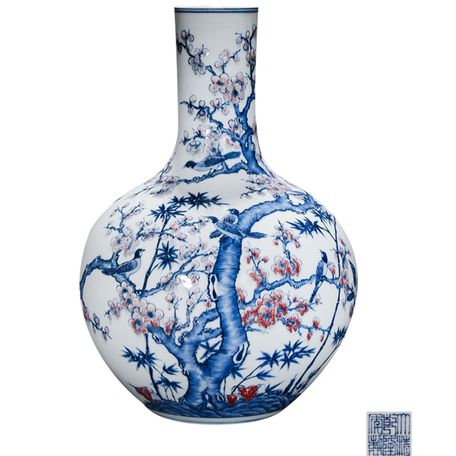 清乾隆 青花釉里红十三喜登梅图天球瓶