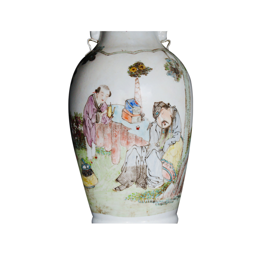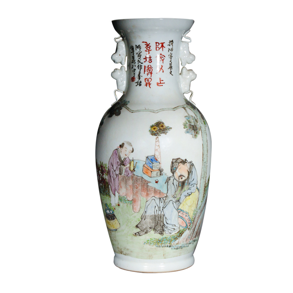 描述:本器盘口,高束颈,颈部对称饰双狮耳,丰肩鼓腹,圈足。通体施白釉为地,釉色莹润如雪,质地细腻纯净。瓶身主体以粉彩精心绘制人物故事图,画面布局疏朗有致,主题鲜明。画中人物或坐或立,衣纹飘逸,神态各异,或低头沉思,或谈笑风生,形象生动传神。周围绘以亭台楼阁、古树山石,笔触细腻,设色清雅,浑然一体。整体粉彩敷色浓淡相宜,红绿对比鲜明而不刺眼,尤其人物面部渲染细腻,充分展现光绪时期粉彩瓷器的艺术特色。