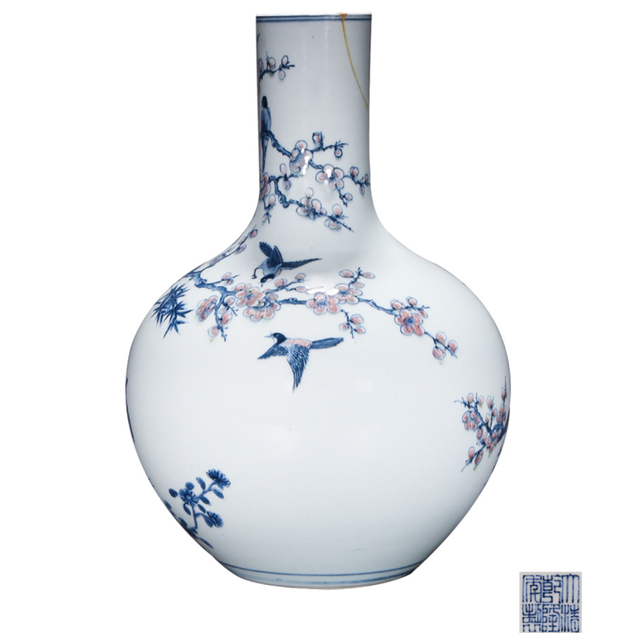 描述:本器直口,长颈,腹部呈圆球形状,圈足,底部落“大清乾隆年制”六字双行篆书款。通体以青花釉里红技法绘“十三喜鹊登梅图,釉面莹润如凝脂,青花发色沉稳幽蓝,釉里红呈色娇艳明快,主体为青花勾勒苍劲梅枝,枝干交错间以釉里红绘梅花,或含苞或盛放,红艳欲滴,与青花枝叶形成鲜明对比。十三只喜鹊姿态各异,或栖于枝头啁啾,或振翅欲飞,或俯冲而下,羽毛以青花浓淡分水技法渲染,层次分明,灵动鲜活。喜鹊与梅花相映成趣,构成“喜上眉梢”的吉祥寓意。整器青花发色沉稳幽蓝,釉里红呈色娇艳明快,工艺精绝,线条流畅,堪称乾隆时期青花釉里红瓷器之典范。