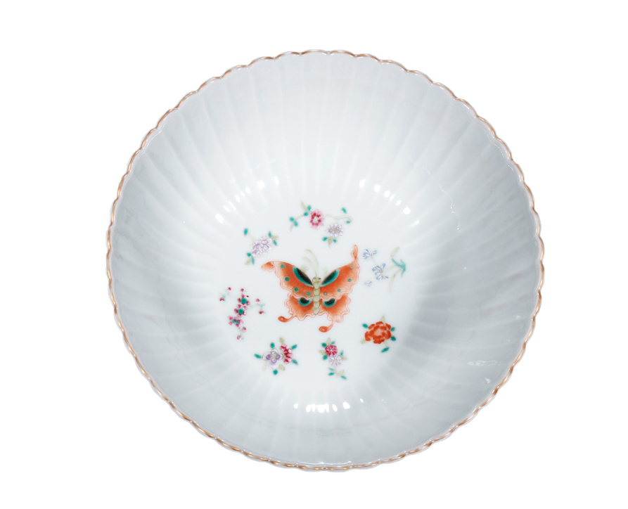 描述:碗呈菊瓣状,花口外撇,深弧腹,平底,矮圈足,底部落“大清光绪年制”款 。碗壁拟取秋菊之形,塑成菊花花瓣,呈盛开的菊花瓣状,线条优雅亦不失华丽之感。内外满施白釉,釉色均匀,莹润可人。通体以粉彩“百蝶富贵"图,所绘蝴蝶五色焕然,身姿各异,缤纷络绎,花果作伴,一派生机。画笔清秀细腻,设色淡雅逸丽,春色盎然,仿若和风拂面,醉人心扉,画意可拟徐熙。整器形制周正,加之精巧而优美的器型,结合静雅纤丽的绘画风格,再配上极为高超的制胎水准,彰显光绪朝洋彩技艺之渗透。