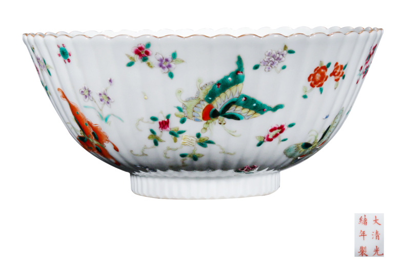 清光绪 粉彩百蝶图瓜棱花口碗