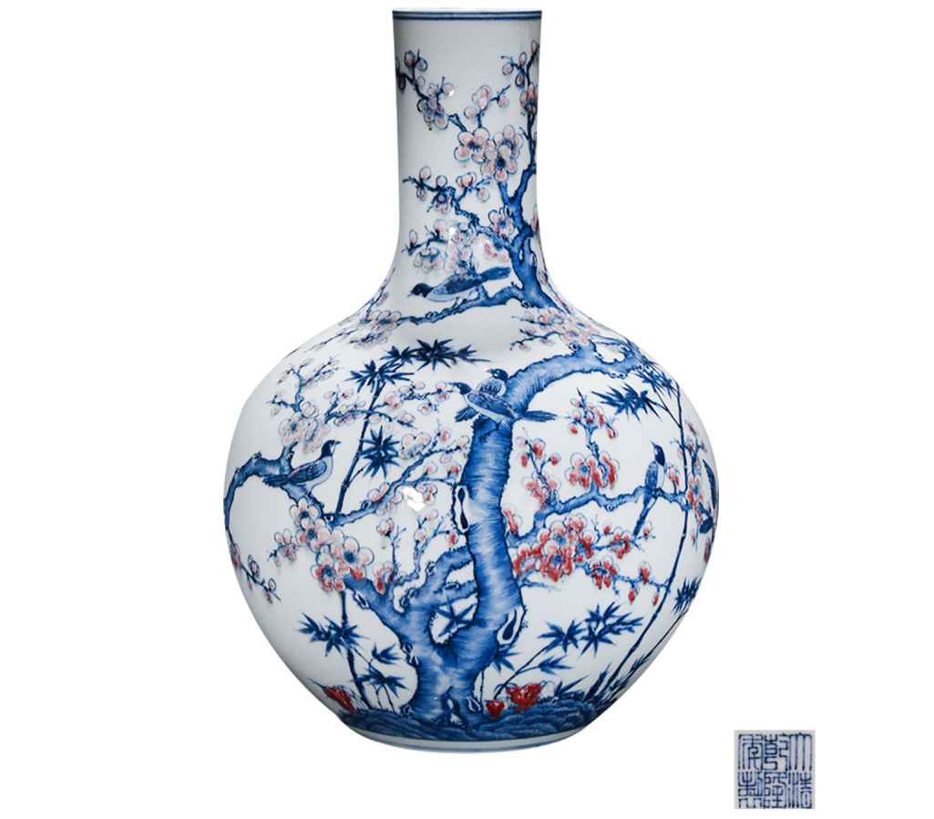 清乾隆 青花釉里红十三喜登梅图天球瓶
