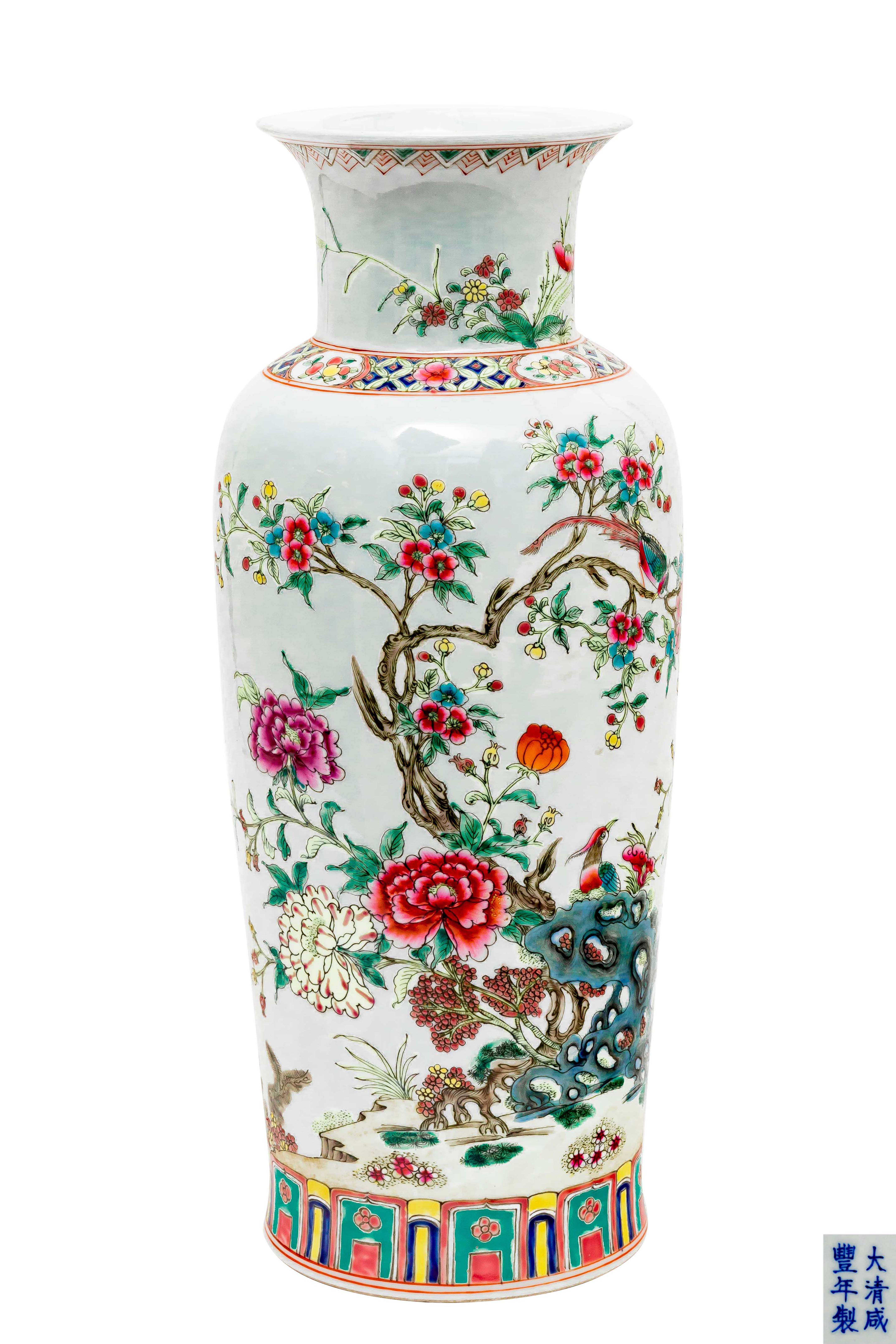 瓶撇口,束颈,丰肩,长圆形腹,圈足。腹部绘山石花卉,外绘洞石花鸟纹,圈足处绘莲瓣纹。纹饰构图饱满,疏密有致。花石采用勾线填色法,色彩浓艳,底部落青花“大清咸丰年年制”款。整器通体点缀牡丹 、月季、菊花,大波期菊,矢车菊、兰花、梅花、海棠、百合,四季花卉等各式花朵,布满器身。花与鸟相配相伴恰是巧妙。千姿百态的花卉,尽显娇媚本色,寓意百花呈瑞,盛世升平,尊贵秀雅,吉祥如意。