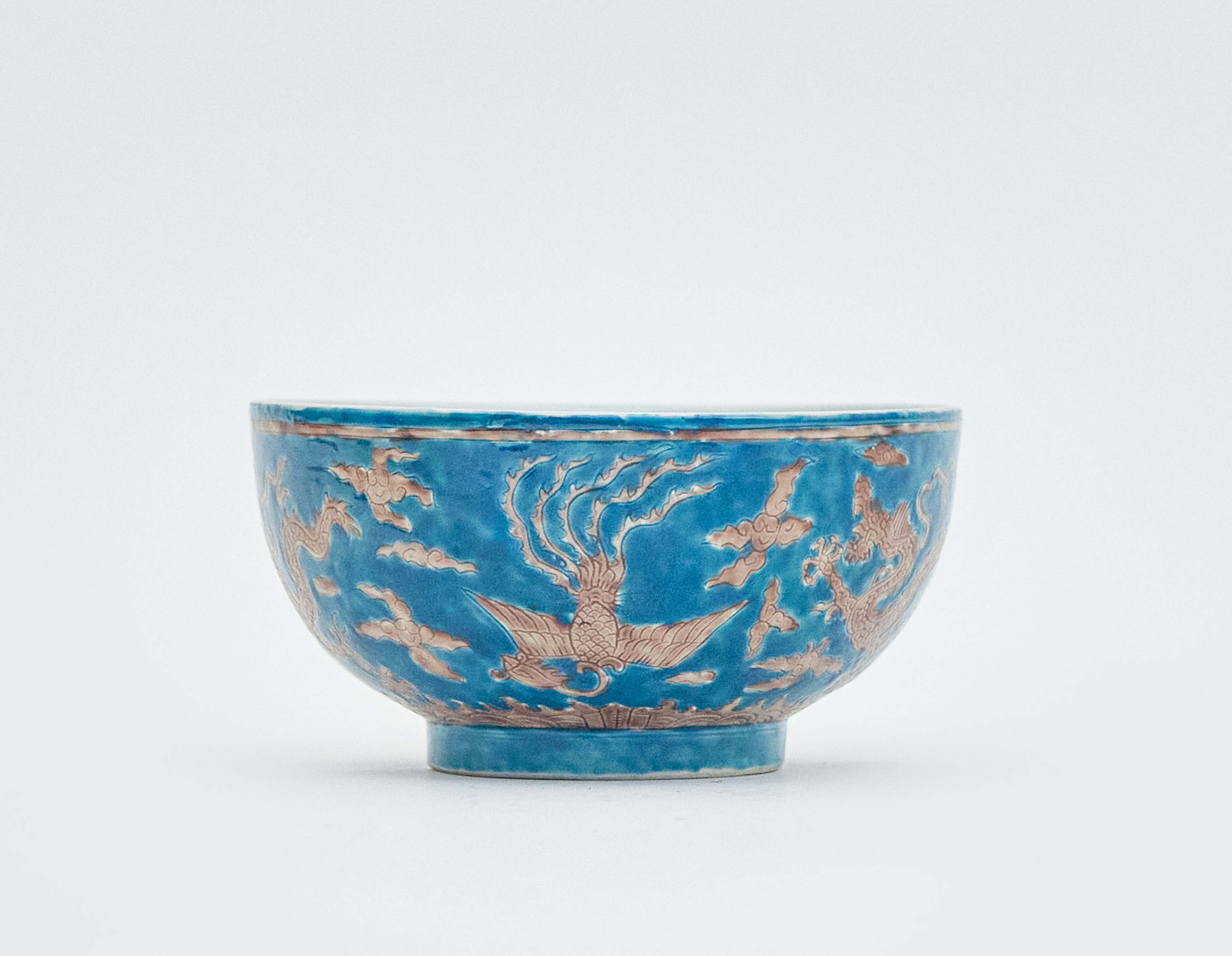 碗敛口,孤壁,圈足,露胎,足内。暗刻“大明嘉靖年制”六字双行楷书款,外壁通体施珐华釉为地,口沿外壁绘弦纹,通体绘云龙凤纹,这种工艺出现于成化时期,制作工序较为复杂,先在素胎上刻龙云凤纹,覆白色透明釉,经高温烧成后,再在刻好的云龙凤纹上绘紫彩,其余施蓝彩,入窑低温焙烧。此器为蓝釉,呈色艳亮,紫彩色泽鲜艳浓重,胎质坚硬致密,细薄如纸,釉面匀净肥润,为典型的宫中御用瓷。