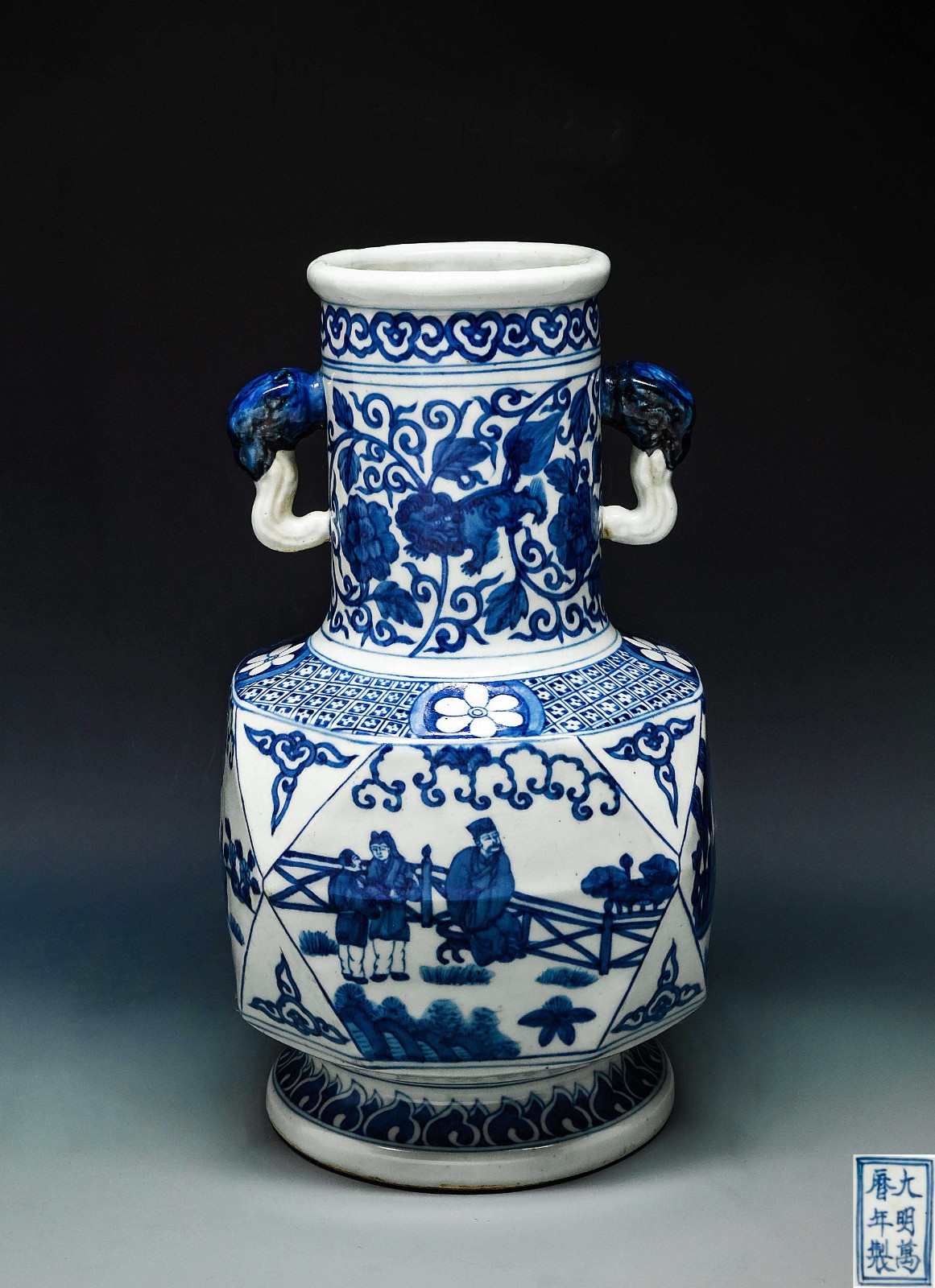 Lot1612 明万历 青花人物故事方形象耳倭角瓶